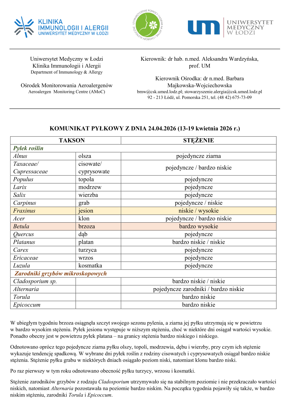Komunikat pyłkowy z 24 kwietnia 2026 r.